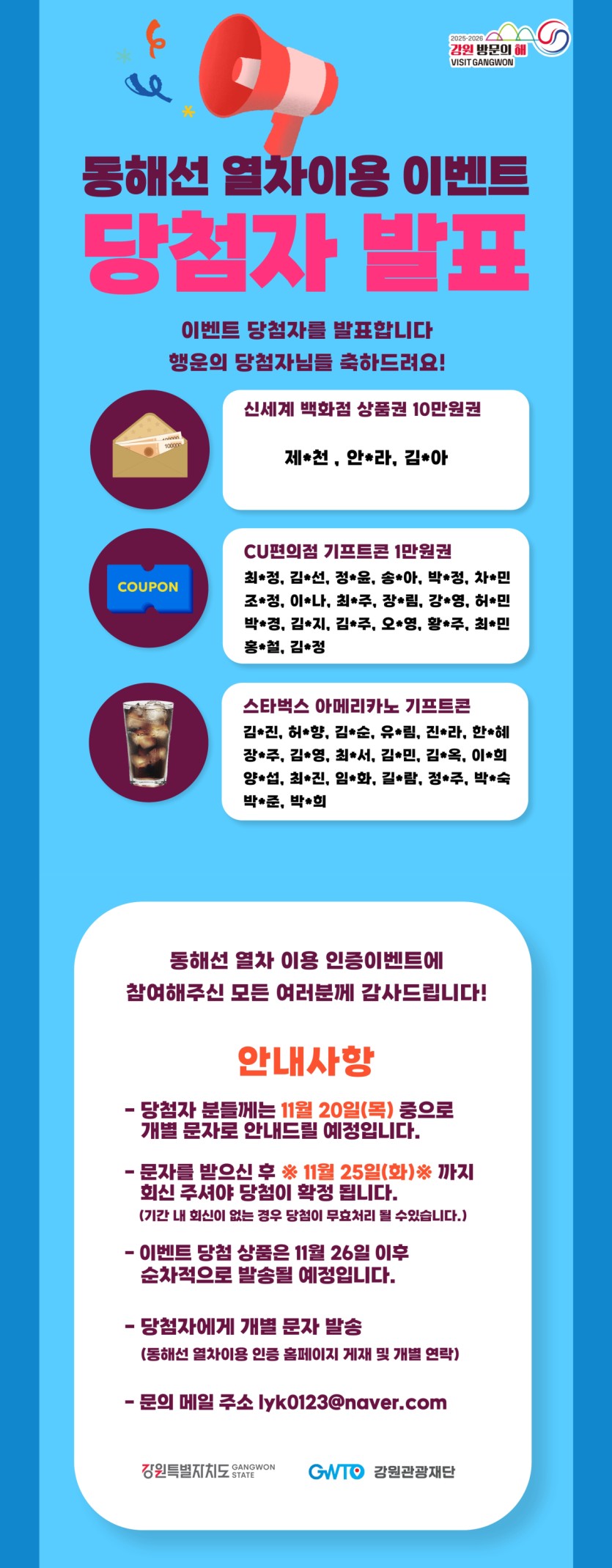 동해선 열차이용 이벤트 당첨자 발표 페이지 정보 작성자 최고관리자 댓글 0건 조회 50회 작성일 25-11-19 13:09 목록 답변 글쓰기 본문 - 댓글 0 댓글목록 등록된 댓글이 없습니다.